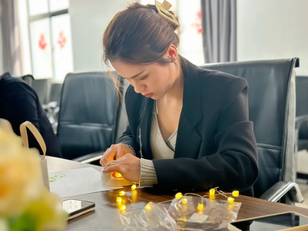 随后大家都迫不及待的动起手来,发挥出自己的创意和想象,细心的制作起来。选材,修剪,粘贴,一个个看似简单的步骤考验着每个人的创造力和动手能力。郁金香小夜灯是一个奇妙世界,女神们用灵巧的双手,让这个小世界亮起来。