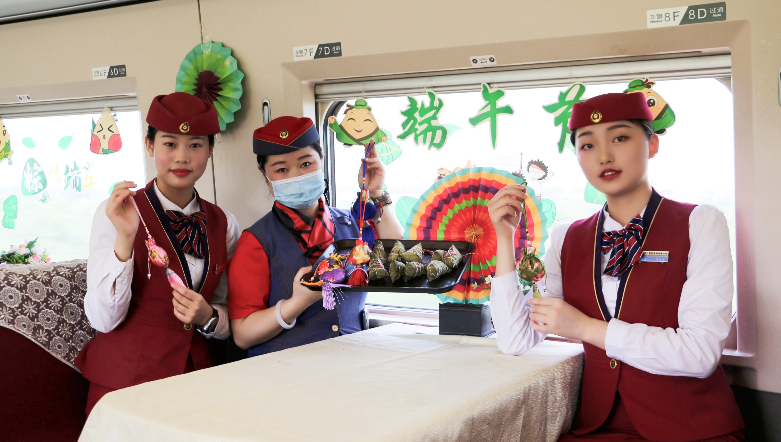 端午节来临之际,在西安北开往深圳的G824次列车上,端午卡通挂件将餐车装扮一新,广州洋友餐饮管理有限公司为乘客精心打造的“浓情端午·弘扬传统文化”主题活动进行的如火如荼。